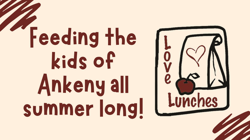 Love Lunches is a summer lunch program for children and their families that is solely supported by church donations and not affiliated with the school district. The West Side site is at Sunset Park, located at 1320 SW 3rd Street. Our Church, along with four other churches: Our Lady Immaculate Heart Catholic Church, Holy Trinity Lutheran Church, St. Luke's the Evangelist Catholic Church, and Ankeny Christian Church, support the West Side by preparing, transporting, and serving food. On average, 100 meals were served at Sunset Park in 2025. The Love Lunch Program this summer will be from June 1 through August 21. Lunch will be served from 11:30 to 12:30, Monday to Friday. Ankeny First has committed to the weeks of June 15-19, August 3-7, and August 17-21, so please prioritize these weeks if you can. But you can volunteer any day all summer! Register today!